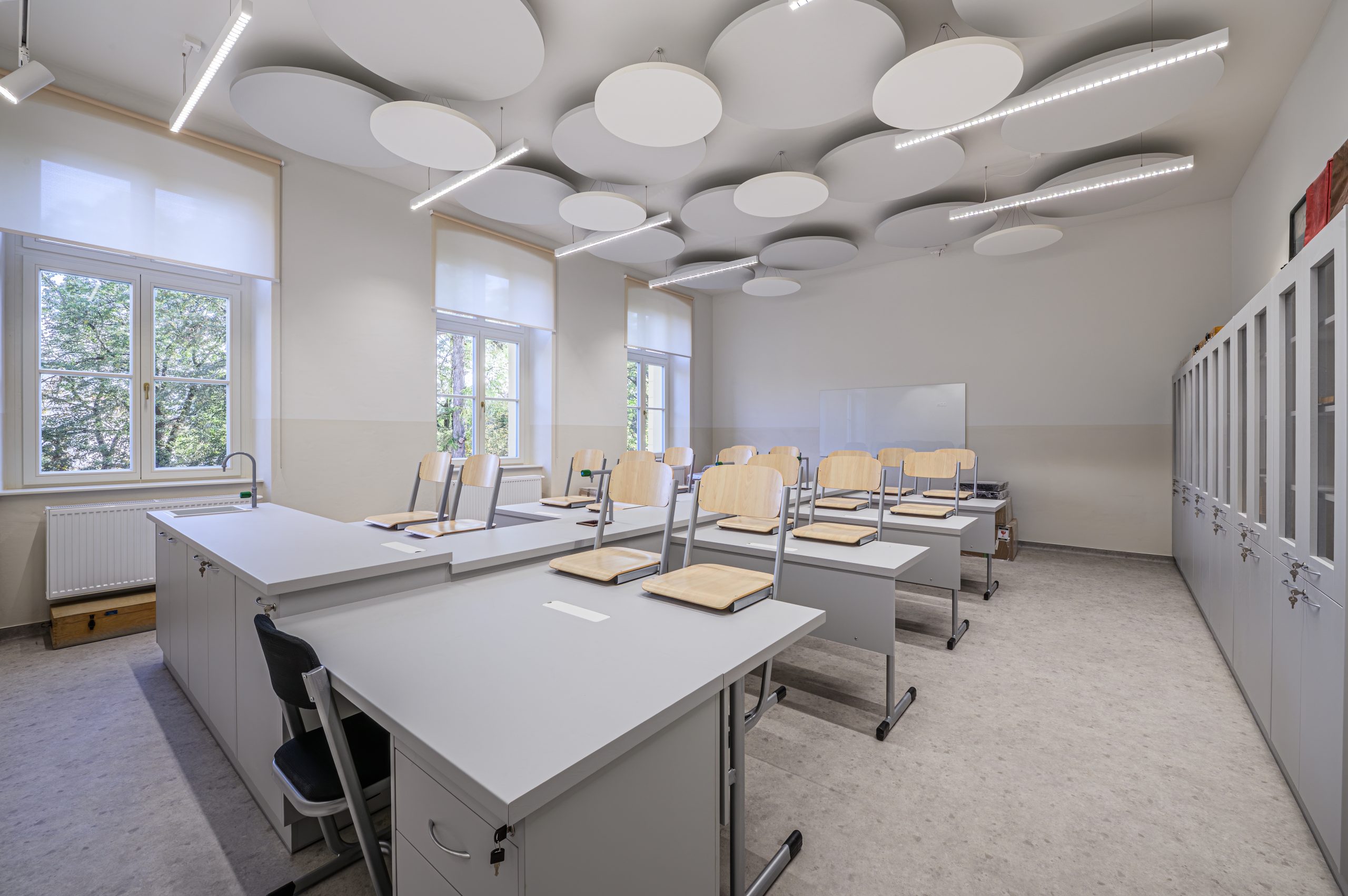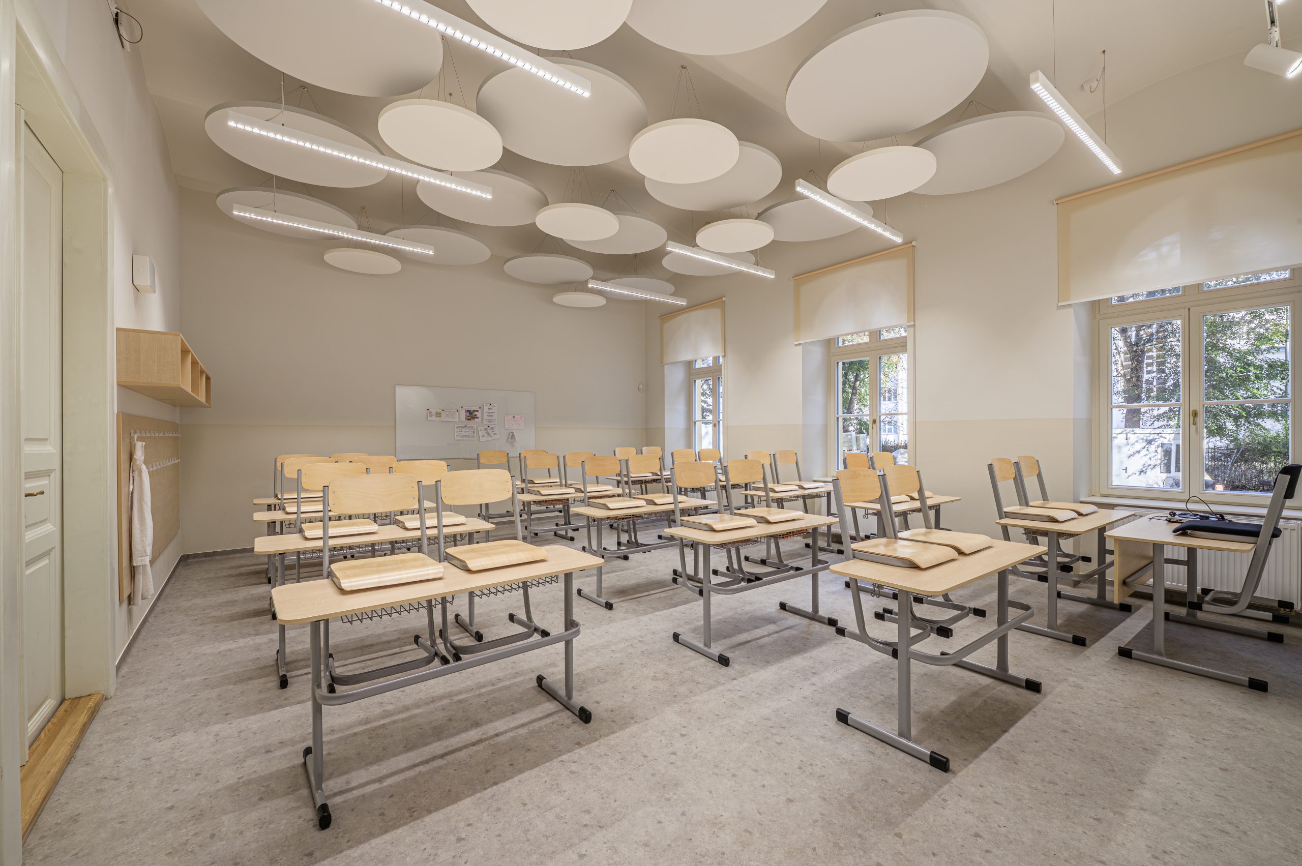 Nad modernou zapustenou telocvičňou vyrástla jedáleň a multifunkčný priestor prestúpený prirodzeným svetlom. Presklené tabule, ktoré tieto časti presvetľujú, sú vsadené do šedých fasádnych dosiek, aby farebne rezonovali so susediacou dopravnou tepnou a drsným ruchom živého mesta. Tvorivé ateliéry žiakov, ktoré sa nachádzajú na poschodí, sú oblečené do farebnej škály historickej budovy gymnázia – hrajú farbami zemitej a krémovej, aby sa priblížili povahe národnej pamiatky. Priaznivá severo-západná a východná strana prináša do ateliérov autentické slnečné svetlo, ktoré veľmi presne odhalí každý nesmelý ťah štetcom žiaka. Rovná strecha tejto dostavby sa chce priblížiť moderným štandardom ekologickejšej politiky a do budúcnosti je pripravená uniesť systém solárnych panelov.